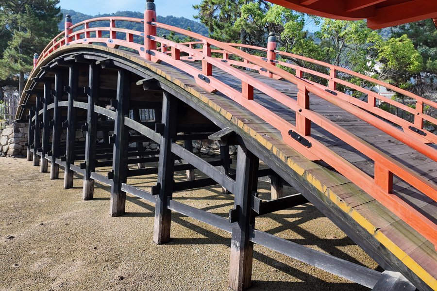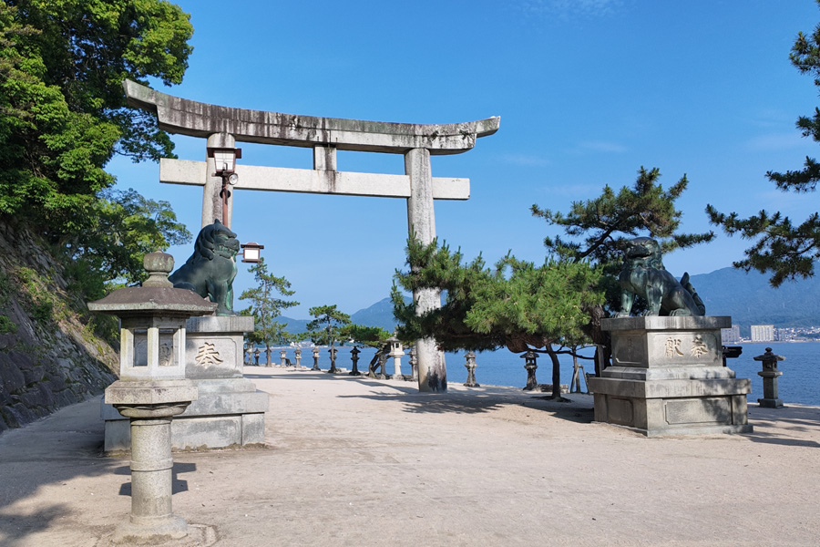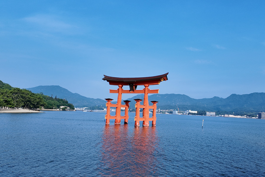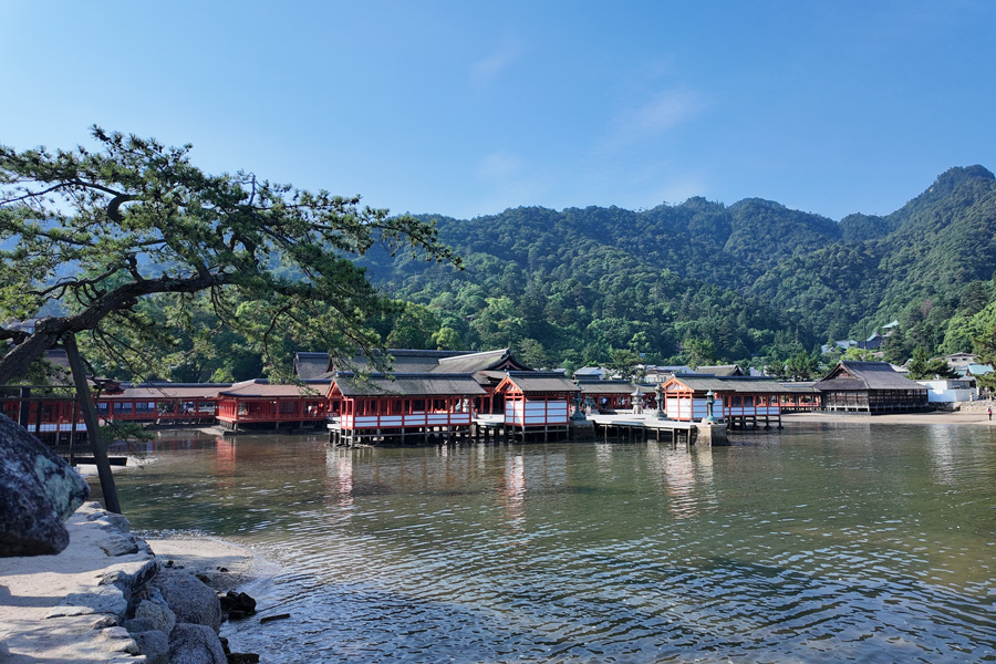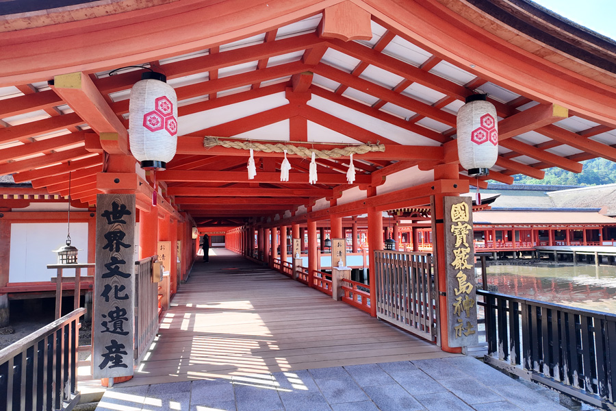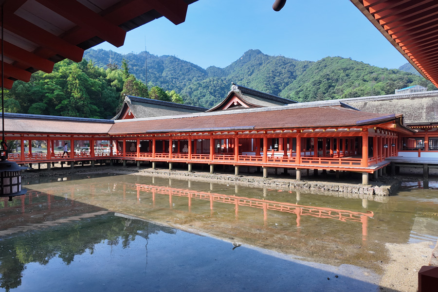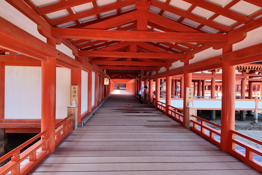 厳島神社は宮島港フェリーターミナルから海岸沿いに参道が通じているが、600mと意外に遠い。のんびり歩いていると、大鳥居が徐々に近づいていく状況にはテンションが上がる。 厳島神社に到着したのは7:30。入場料500円(宝物館込み)を払って入場する。平日の早朝とあって参拝客はほとんどおらず、ほぼ独占状態と贅沢な状況で堪能した。 厳島神社を出て、ほかの観光スポットを巡ったあとの昼頃、この神社を外から眺めたときに見た混雑は尋常ではなかった。早朝に参拝したのは改めて好判断だと思った。しかし、干潮時に大鳥居まで近づき間近で見るということは次回の課題に残った。