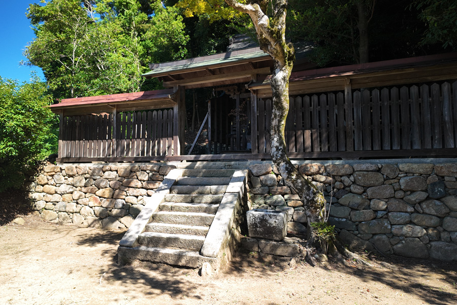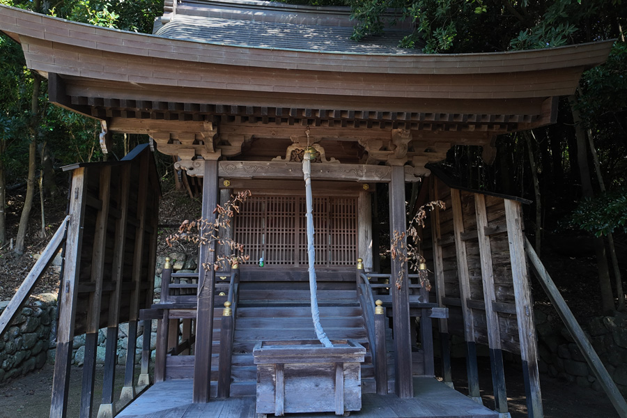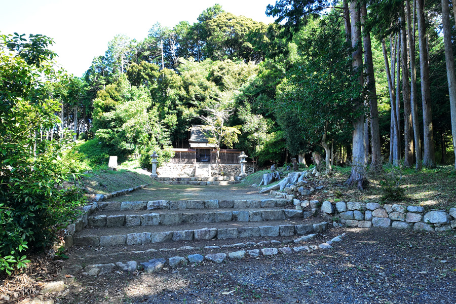 甲賀市油日にある所謂「油日(あぶらひ)神社」の西500m程度で、 道路脇に案内板が立っていなければ、通り過ぎてしまいそうな場所。 車道から社殿までは50m程度奥まった場所にある。 参道はキレイに清掃され、地元の人に親しまれている神社であろうことが窺える。 石垣の上に社殿が建ち、10段程度の石段を上ると、猿田彦大神を祀った小さな本殿がある。
