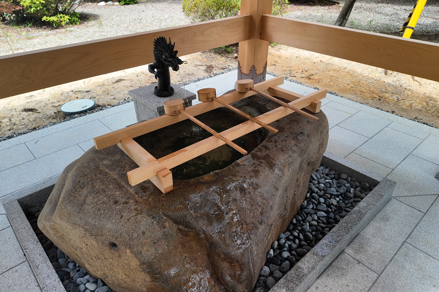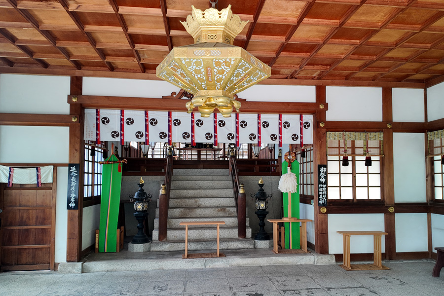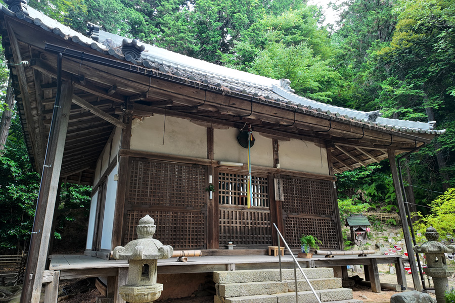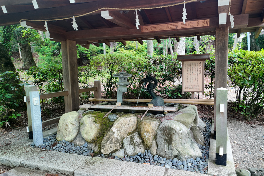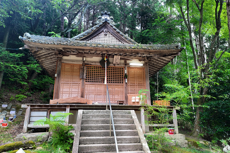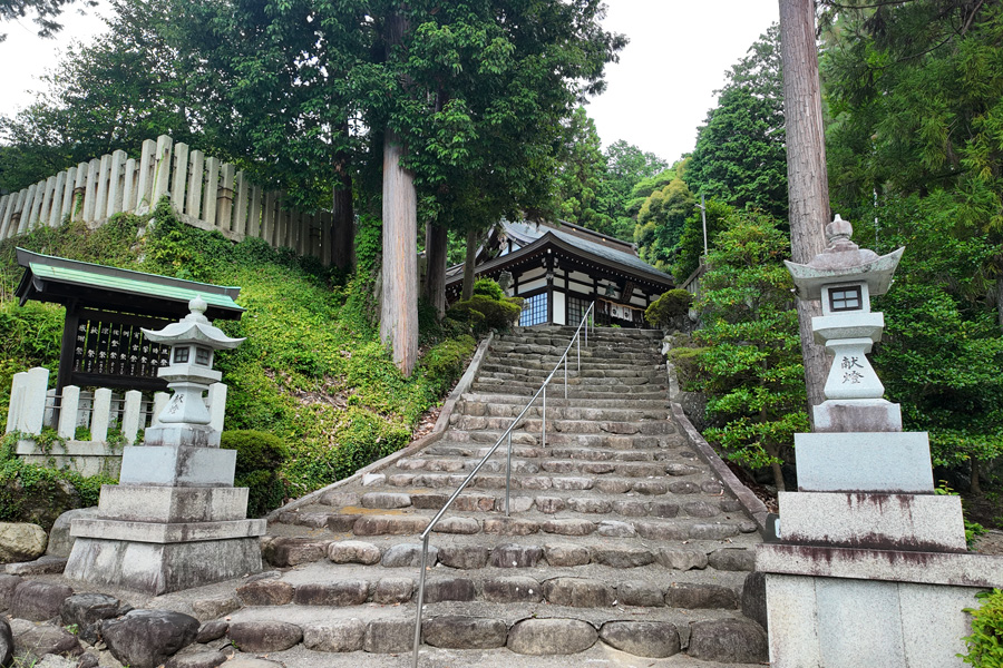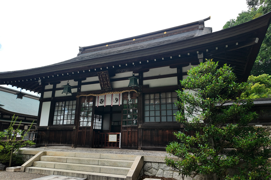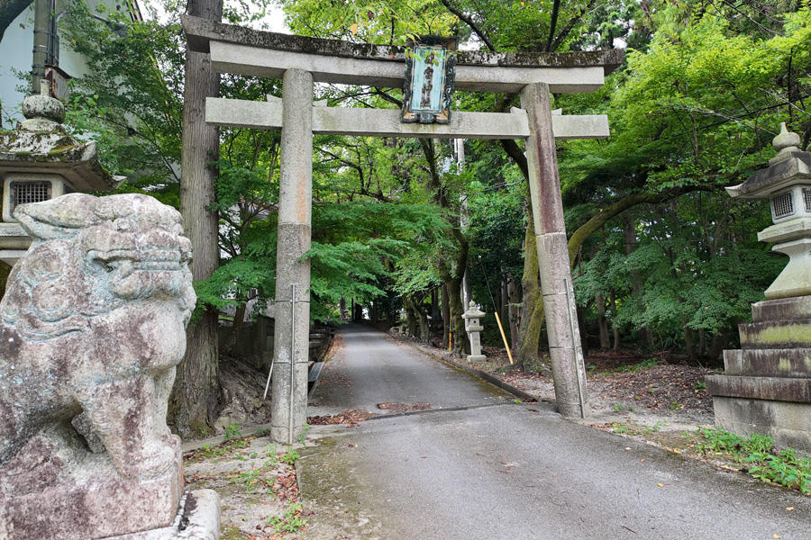 多賀大社の南1km程度の場所。 名神高速道路と国道307号が交差する付近。 国道から案内板に従い林の中に入るとすぐ鳥居がある。 鳥居の手前の駐車場から鳥居をくぐって境内に踏み出す。 数分歩くと左手に石段。その階段を登ると拝殿と本殿。