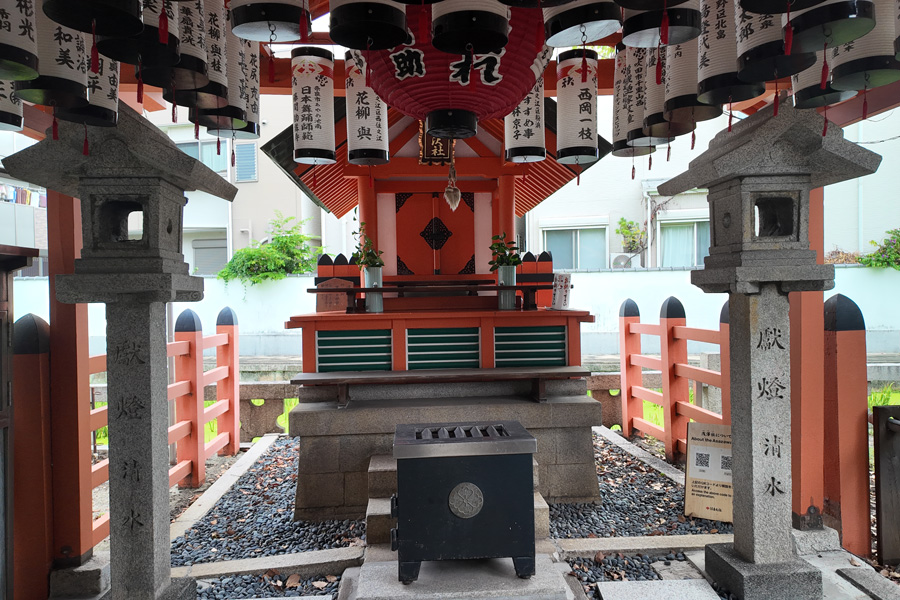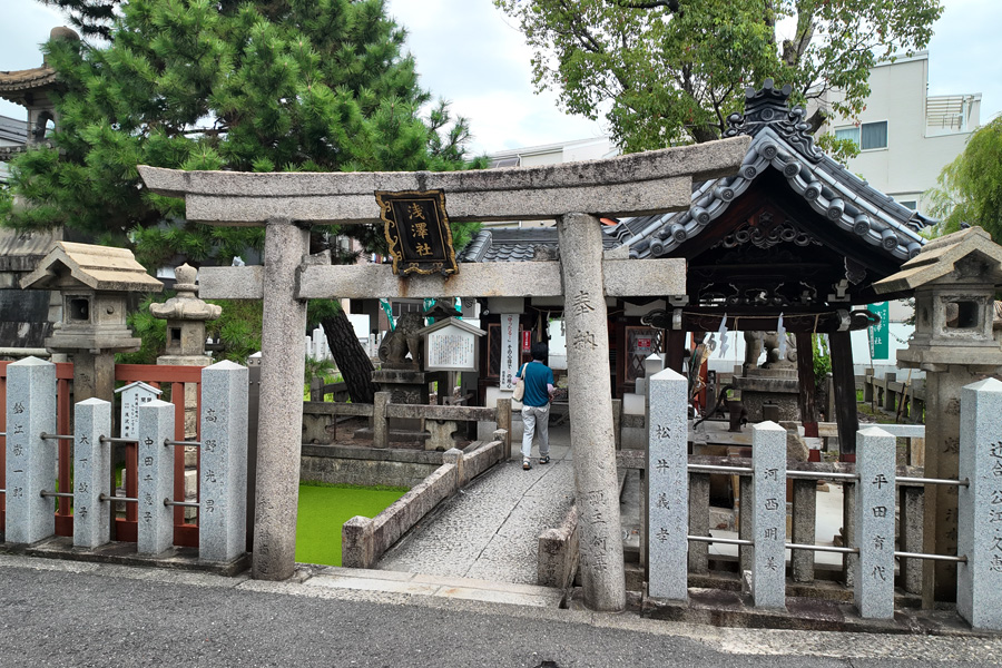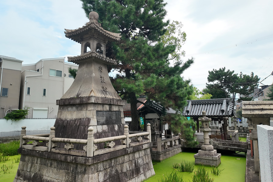 住吉大社の境外末社。 住吉大社の南門を出て数分歩いた場所にある。 周囲を池に囲まれた小さな神社だった。 その池はアオコ?で覆われ一面緑色という姿。 開花時期の初夏には、カキツバタが咲き乱れ、 見事だというが、今は時期外れで葉っぱのみ。